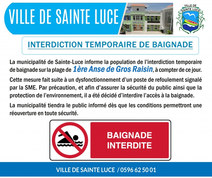 Baignade interdite sur la Plage de 1ère Anse à Gros Raisin